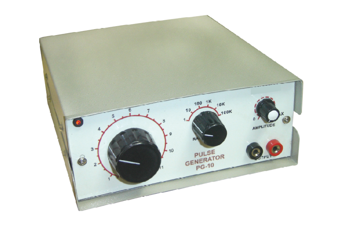 The Pulse Generator PG-10 is a versatile laboratory instrument designed to generate a square waveform pulse train with 50% duty cycle at any desired frequency, using switchable decade ranges. With an adjustable amplitude from 100mV to 10V peak-to-peak, the PG-10 ensures low distortion, high stability, and reliable performance for various testing and R&D applications.